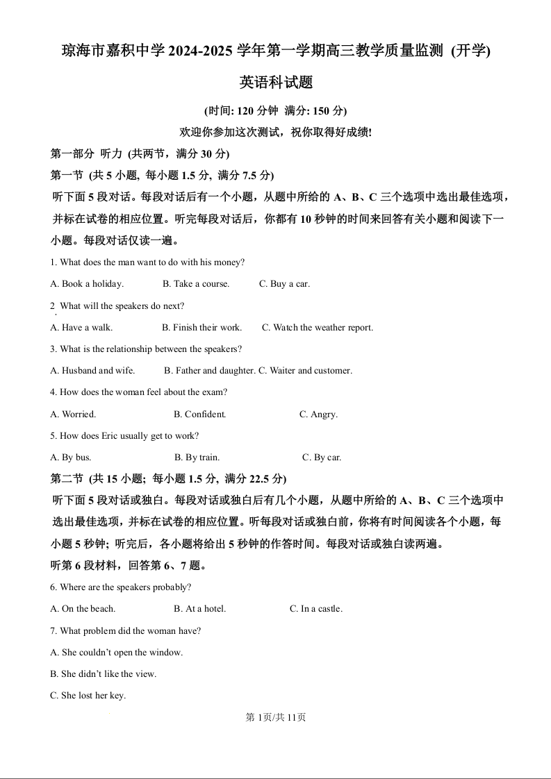 海南省琼海市嘉积中学2024-2025学年第一学期高三教学质量检测英语试题 (原卷版)