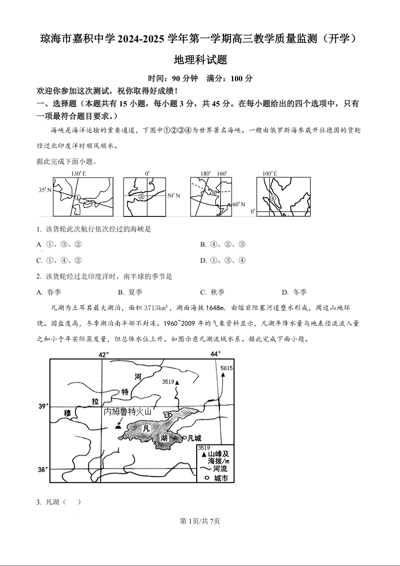 海南省琼海市嘉积中学2024-2025学年第一学期高三教学质量检测地理试题(原卷版)