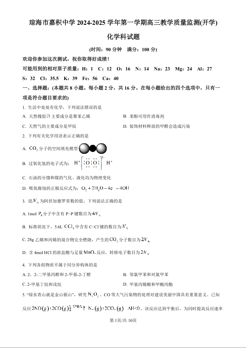 海南省琼海市嘉积中学2024-2025学年第一学期高三教学质量检测化学试题(原卷版)