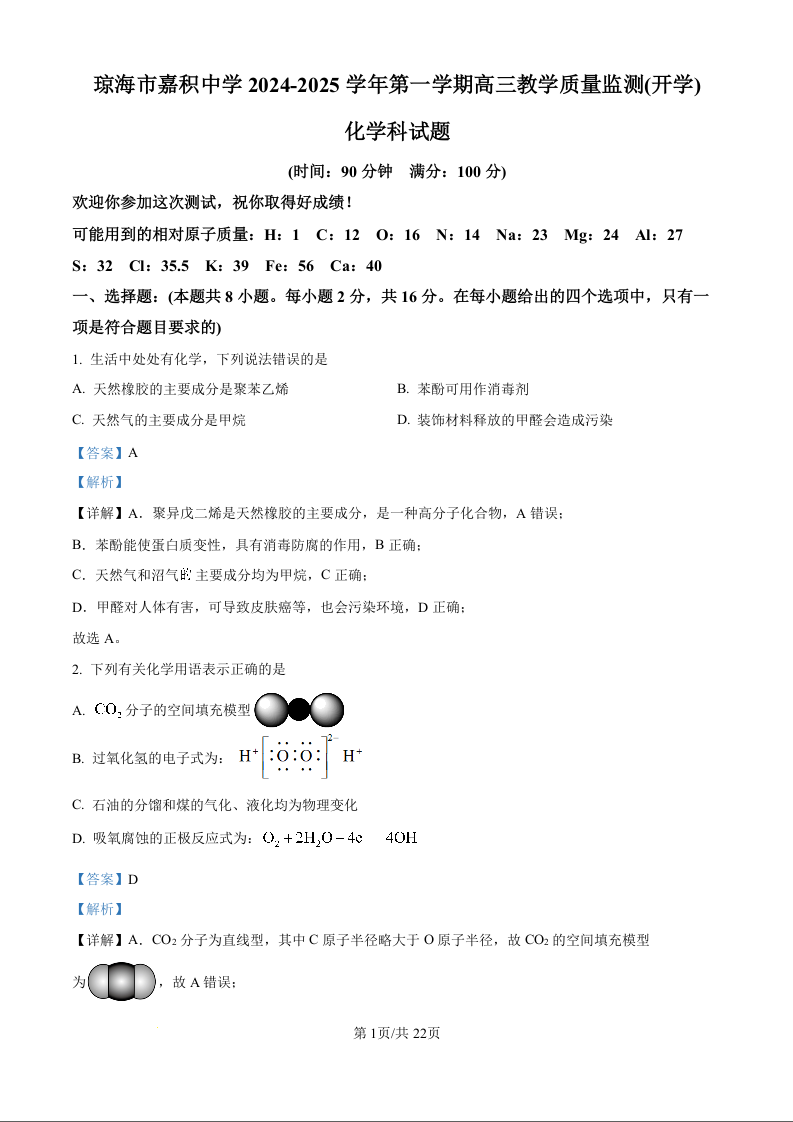 海南省琼海市嘉积中学2024-2025学年第一学期高三教学质量检测化学试题(解析版)