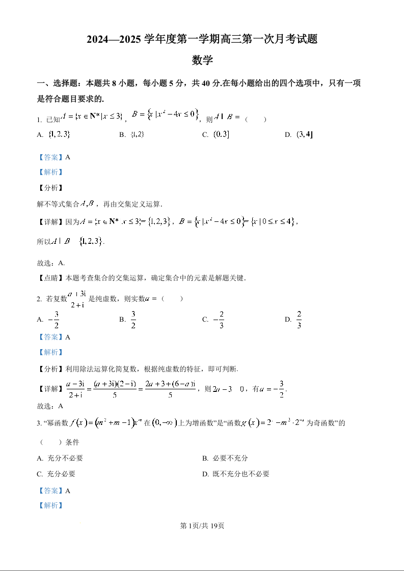 海南省文昌中学2024-2025学年度第一学期高三第一次月考试题数学试题(解析版)