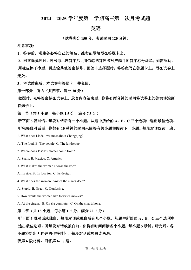 海南省文昌中学2024-2025学年度第一学期高三第一次月考试题英语试题(解析版)