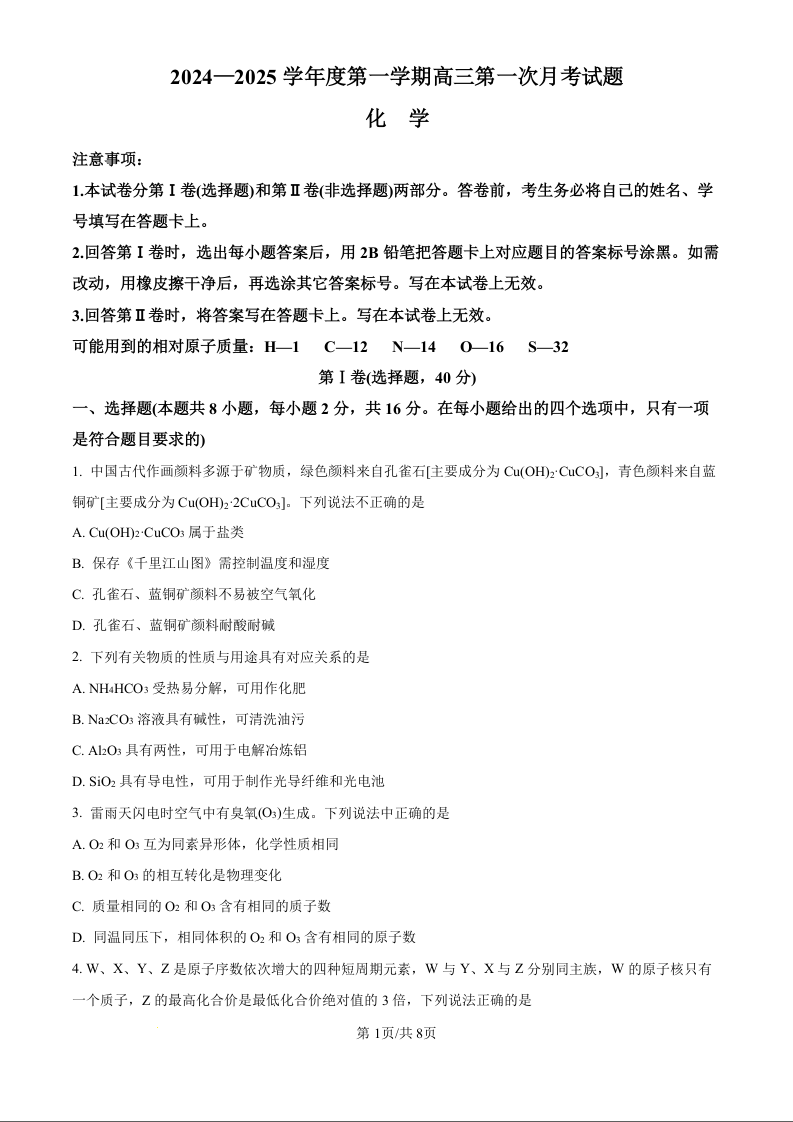 海南省文昌中学2024-2025学年度第一学期高三第一次月考试题化学试题(原卷版)