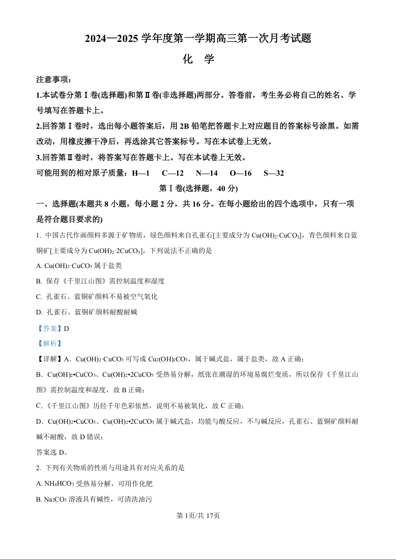 海南省文昌中学2024-2025学年度第一学期高三第一次月考试题化学试题(解析版)