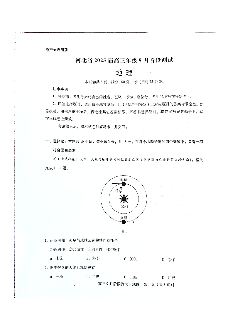 河北省2025届高三9月阶段性检测地理