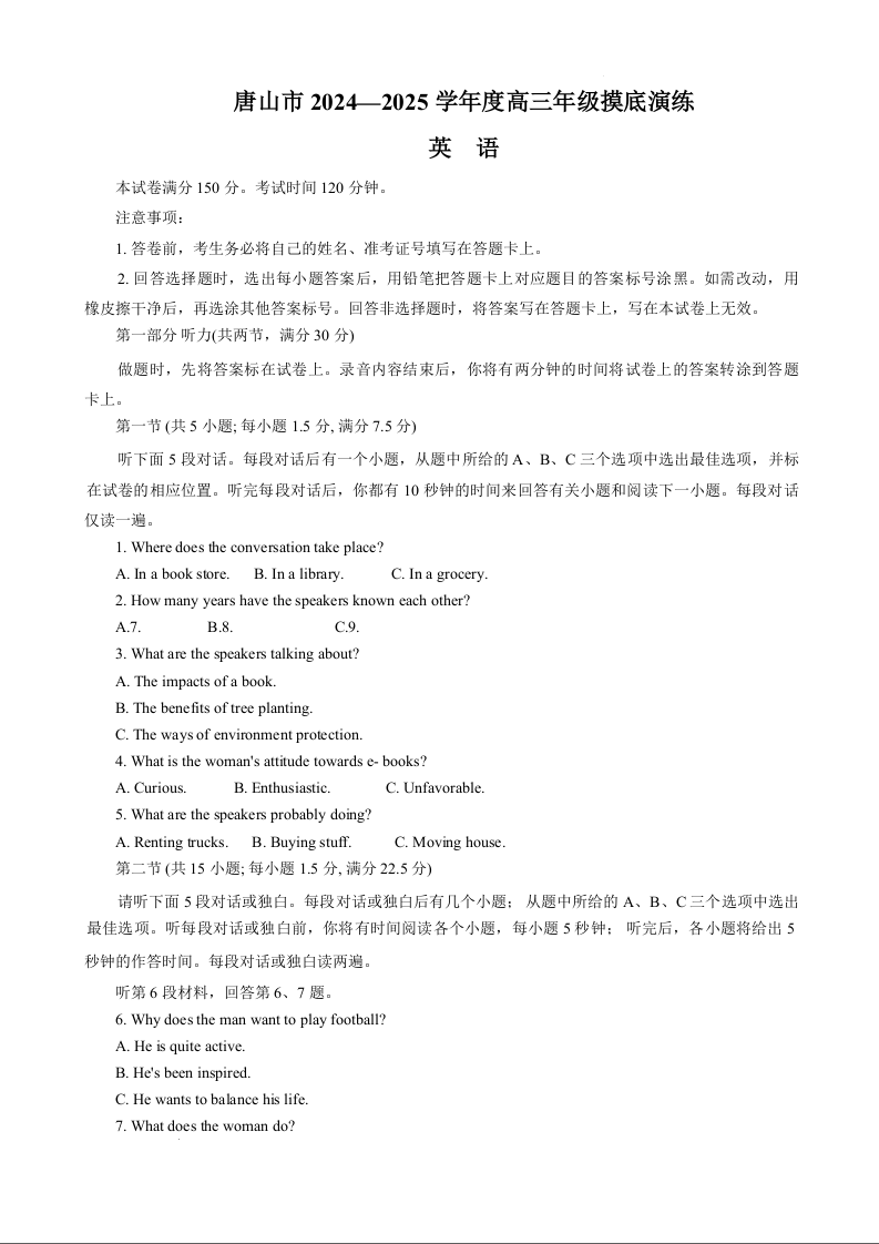 河北省唐山市2024-2025学年度高三年级开学摸底演练英语