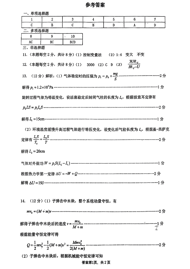 河北省唐山市2024-2025学年度高三年级开学摸底演练物理答案