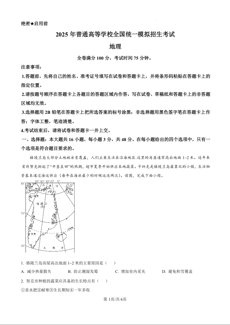 河南省2025年普通高等学校全国统一模拟招生考试9月联考地理试题(原卷版)