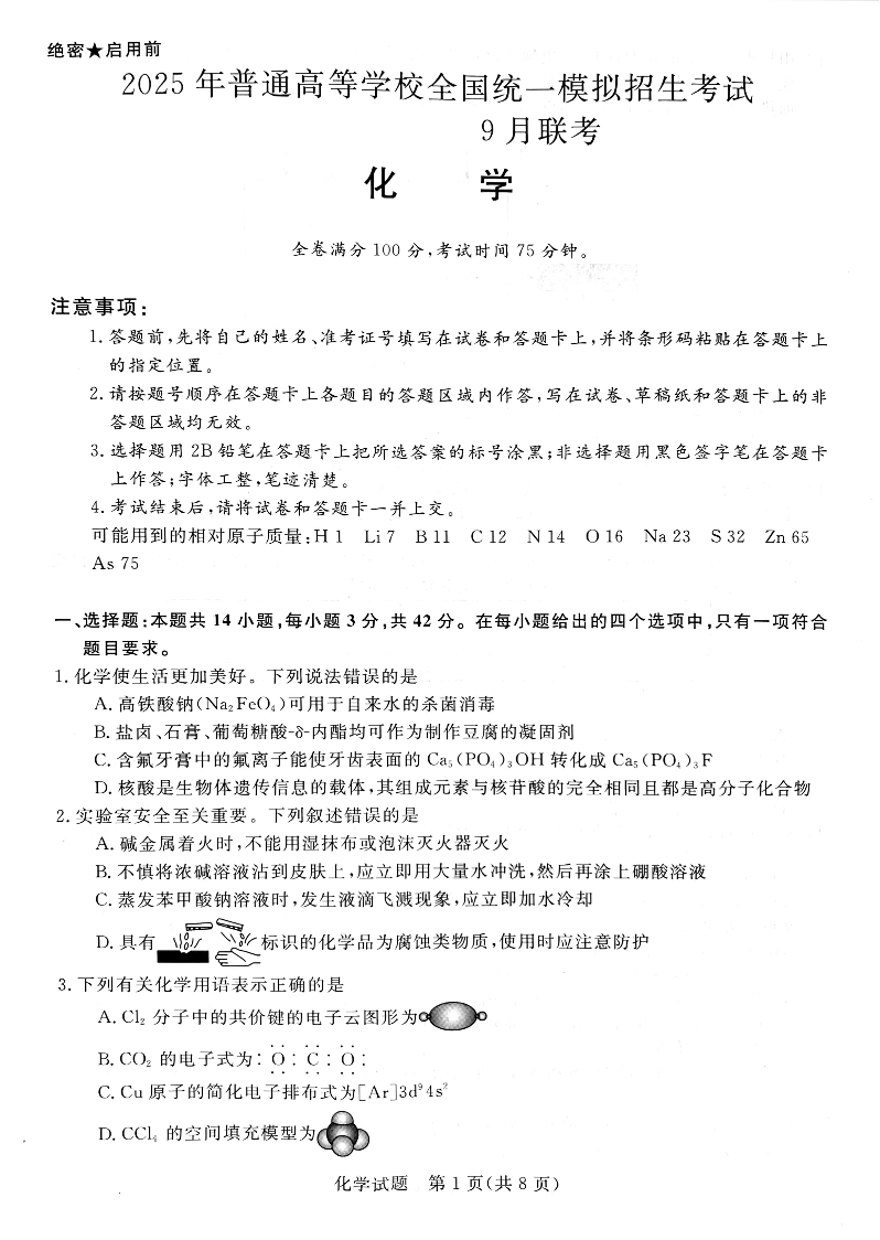 河南省2025年普通高等学校全国统一模拟招生考试9月联考化学