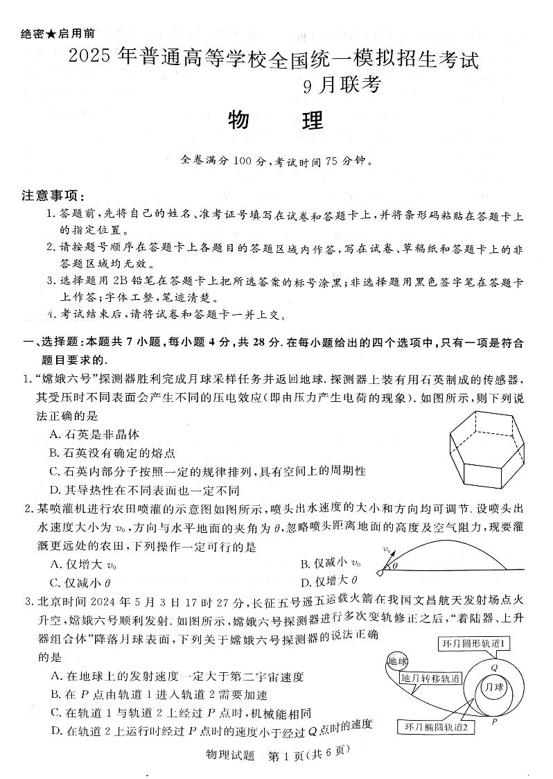 河南省2025年普通高等学校全国统一模拟招生考试9月联考物理