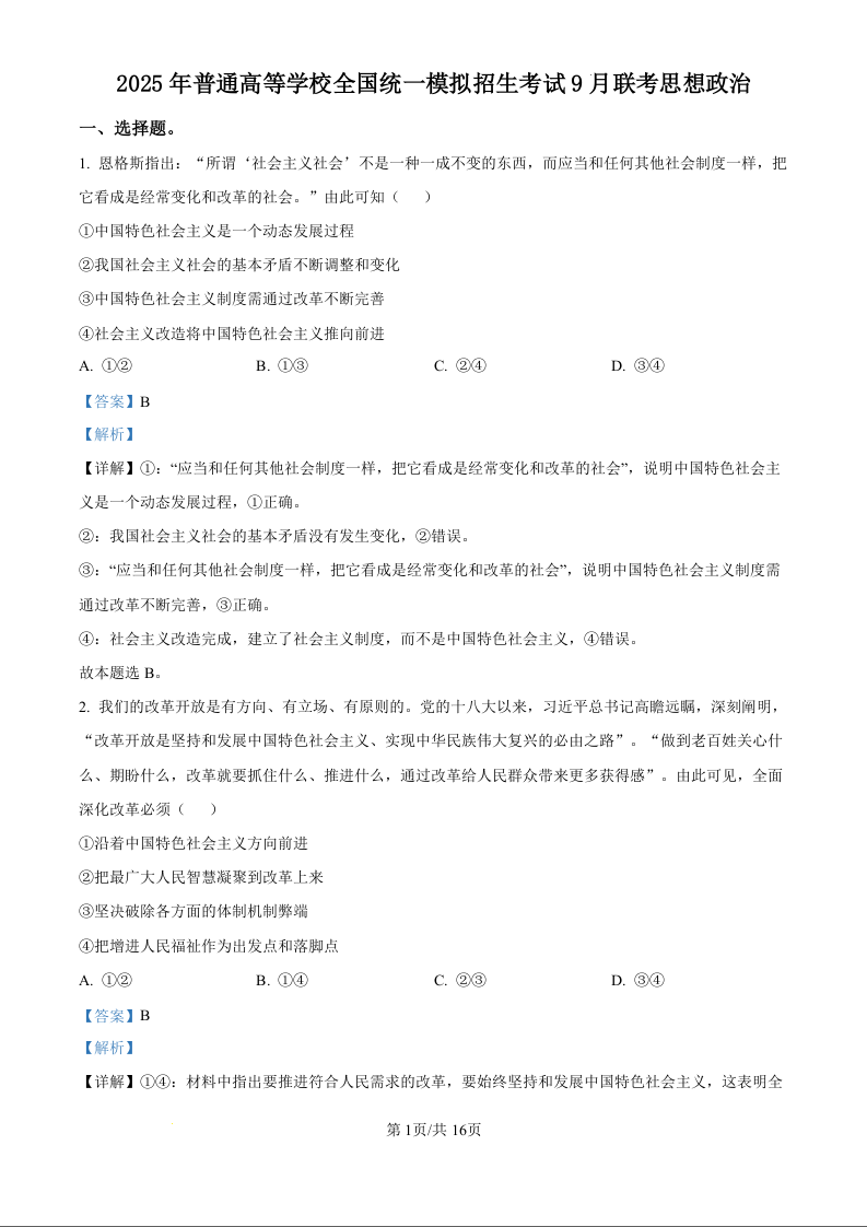 河南省2025年普通高等学校全国统一模拟招生考试9月联考政治试题(解析版)