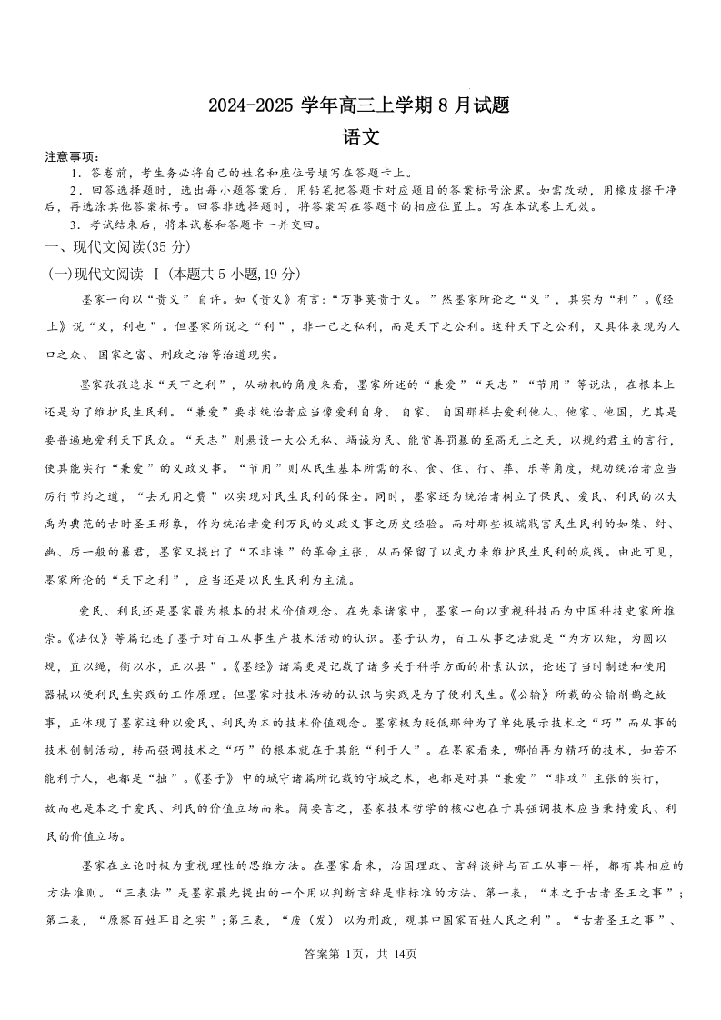 河南省安阳市林州市第一中学2025届高三上学期8月月考语文
