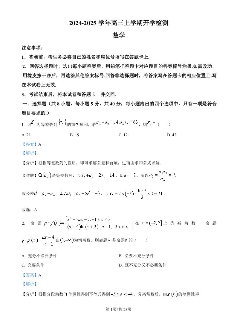 河南省许昌高级中学2024-2025学年高三上学期开学检测数学试题(解析版)