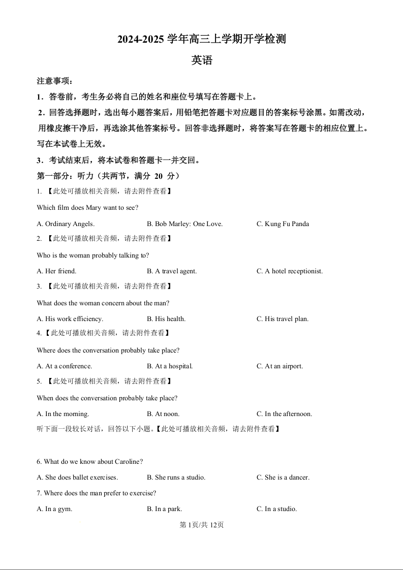 河南省许昌高级中学2024-2025学年高三上学期开学检测英语试题(原卷版)