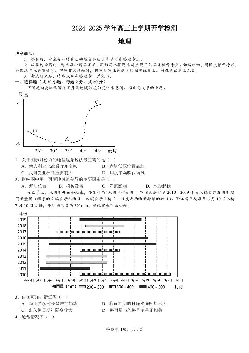 河南省许昌高级中学2024-2025学年高三上学期开学检测地理