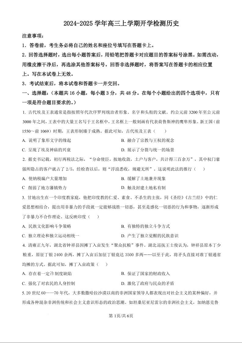 河南省许昌高级中学2024-2025学年高三上学期开学检测历史试题(原卷版)