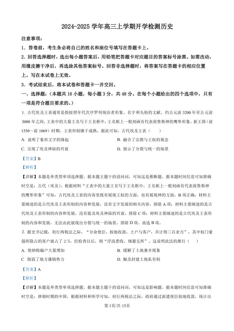 河南省许昌高级中学2024-2025学年高三上学期开学检测历史试题(解析版)