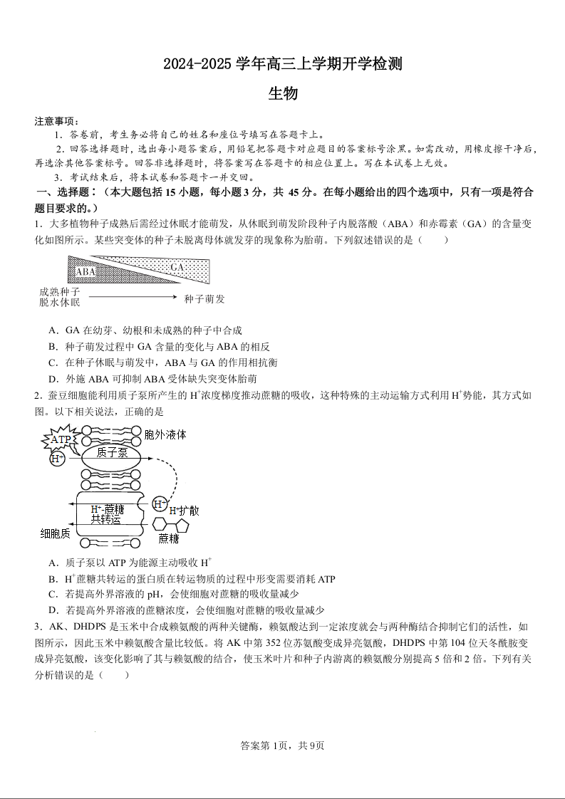 河南省许昌高级中学2024-2025学年高三上学期开学检测生物