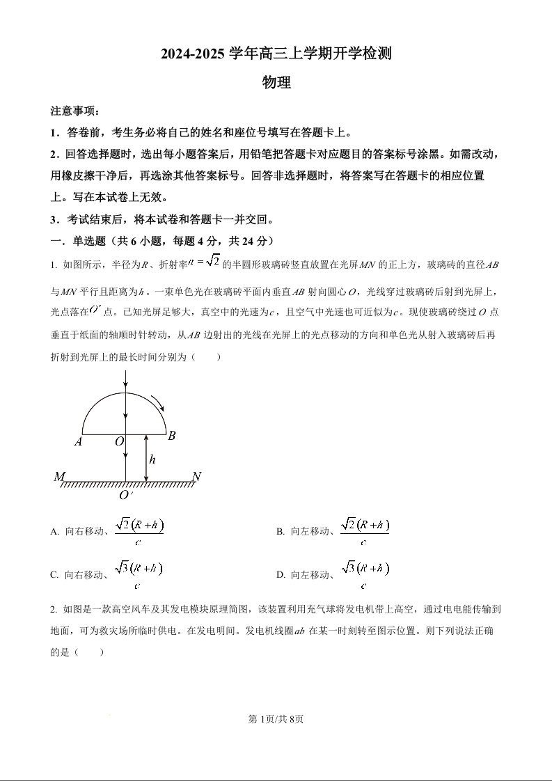 河南省许昌高级中学2024-2025学年高三上学期开学检测物理试题(原卷版)
