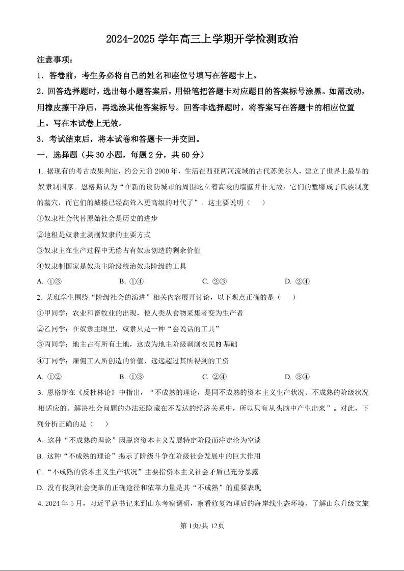 河南省许昌高级中学2024-2025学年高三上学期开学检测政治试题(原卷版)