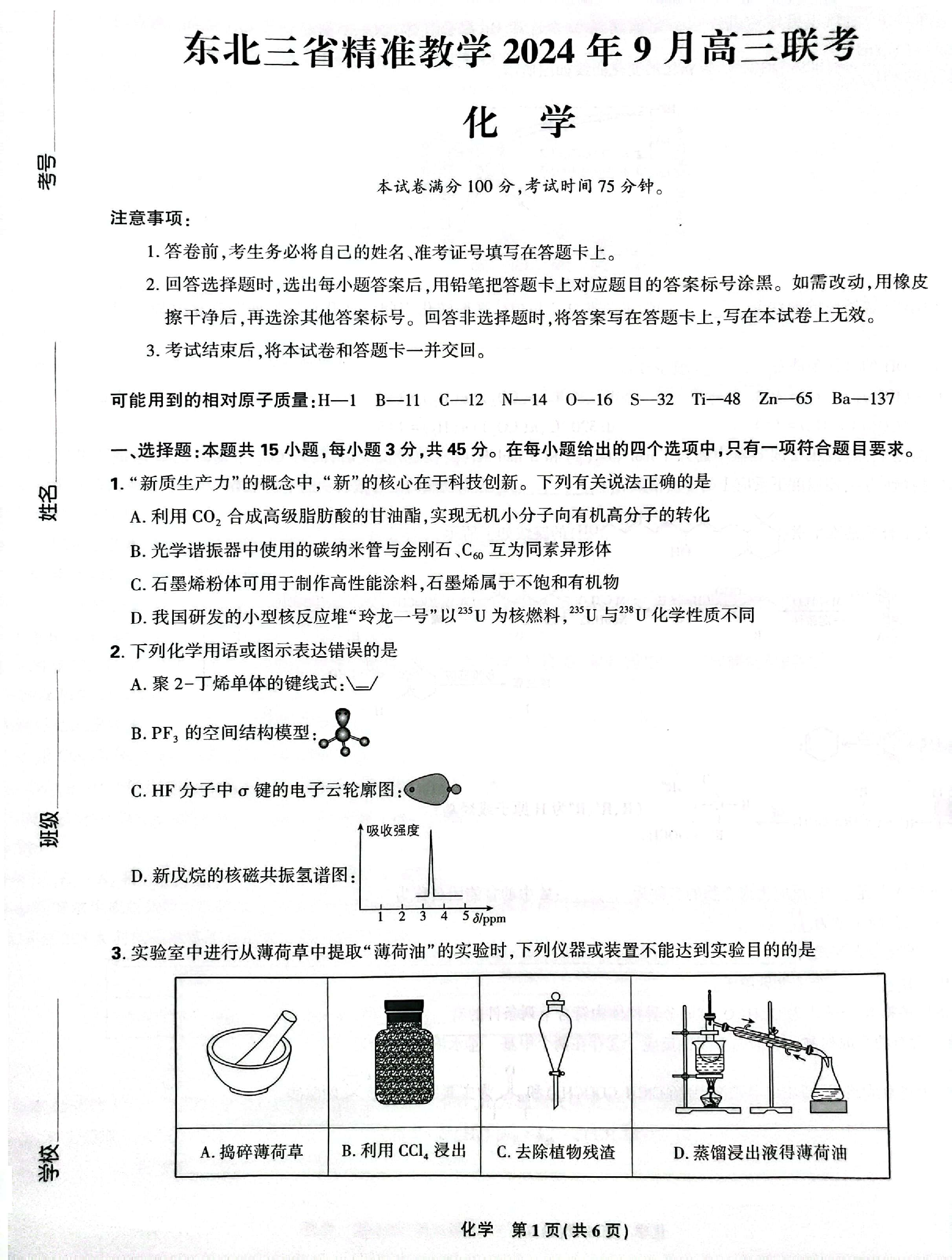 东北三省精准教学2024年9月高三联考化学