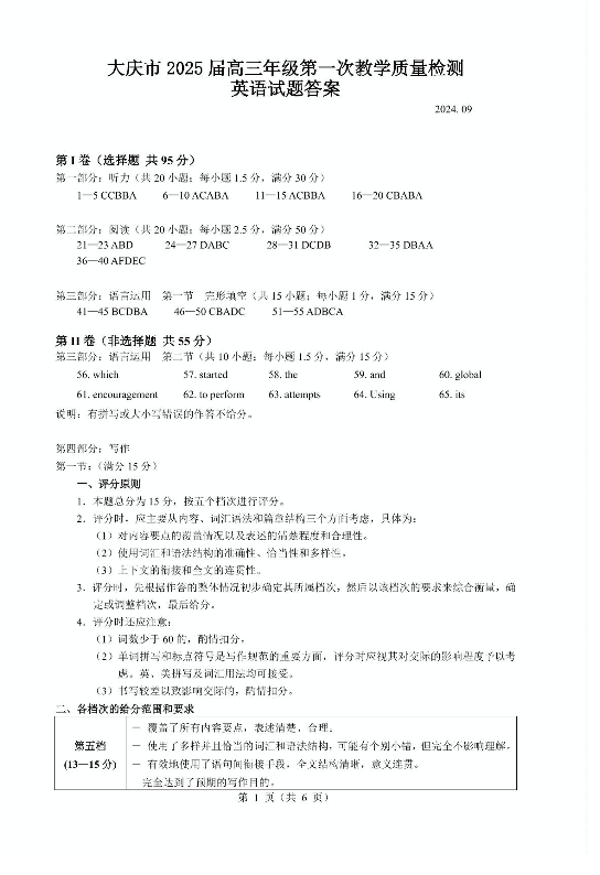 黑龙江省大庆市2025届高三上学期第一次教学质量检测英语答案
