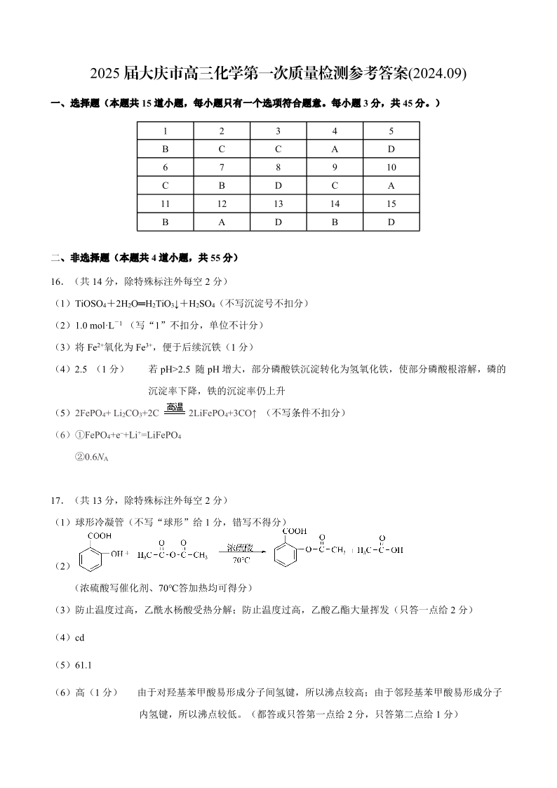 黑龙江省大庆市2025届高三上学期第一次教学质量检测化学答案