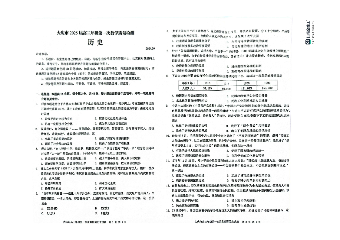 黑龙江省大庆市2025届高三上学期第一次教学质量检测历史