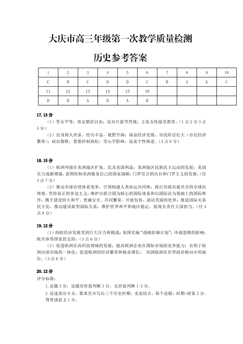 黑龙江省大庆市2025届高三上学期第一次教学质量检测历史答案