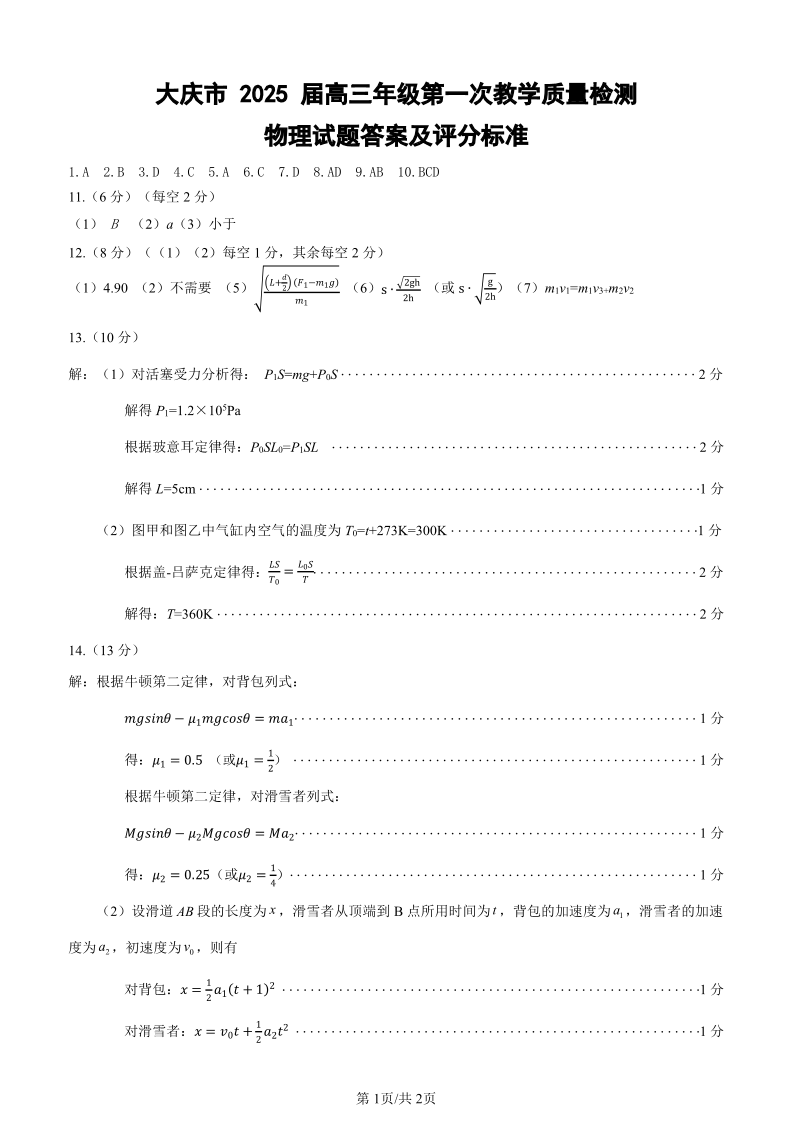 黑龙江省大庆市2025届高三上学期第一次教学质量检测物理答案