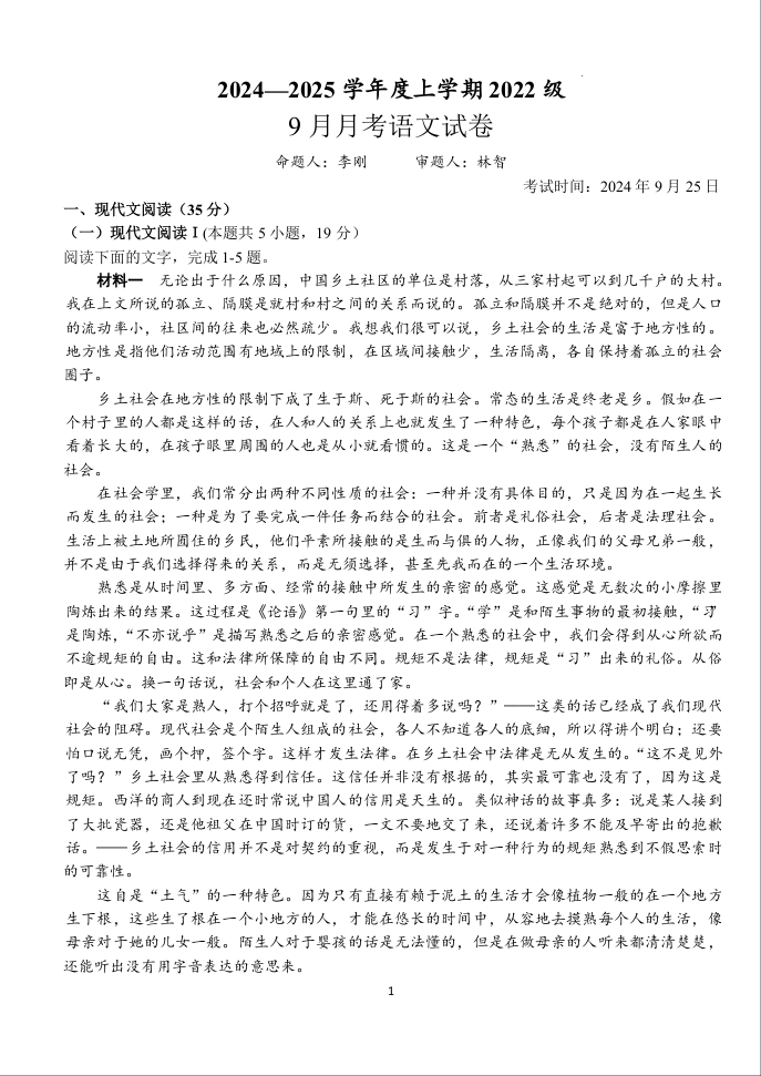 湖北省沙市中学2024-2025学年度上学期2022级9月月考语文
