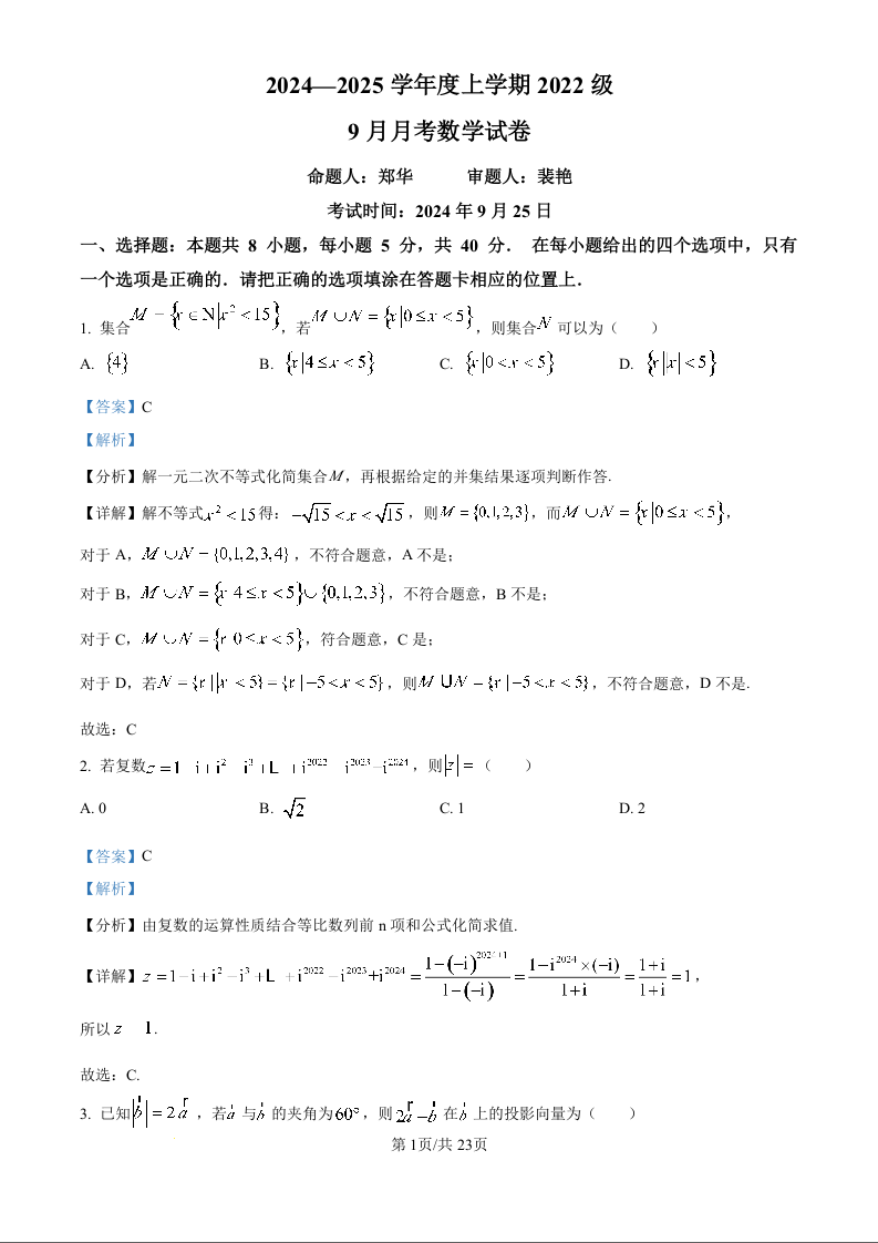湖北省沙市中学2024-2025学年度上学期2022级9月月考数学试题(解析版)