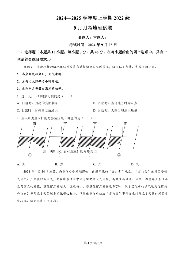 湖北省沙市中学2024-2025学年度上学期2022级9月月考地理试题(原卷版)