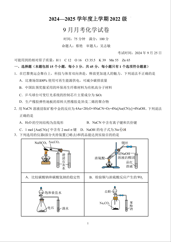 湖北省沙市中学2024-2025学年度上学期2022级9月月考化学