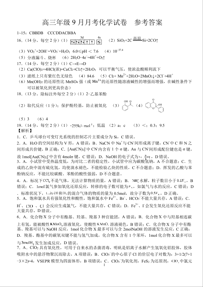湖北省沙市中学2024-2025学年度上学期2022级9月月考化学答案