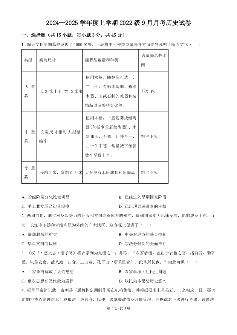 湖北省沙市中学2024-2025学年度上学期2022级9月月考历史试题(原卷版)