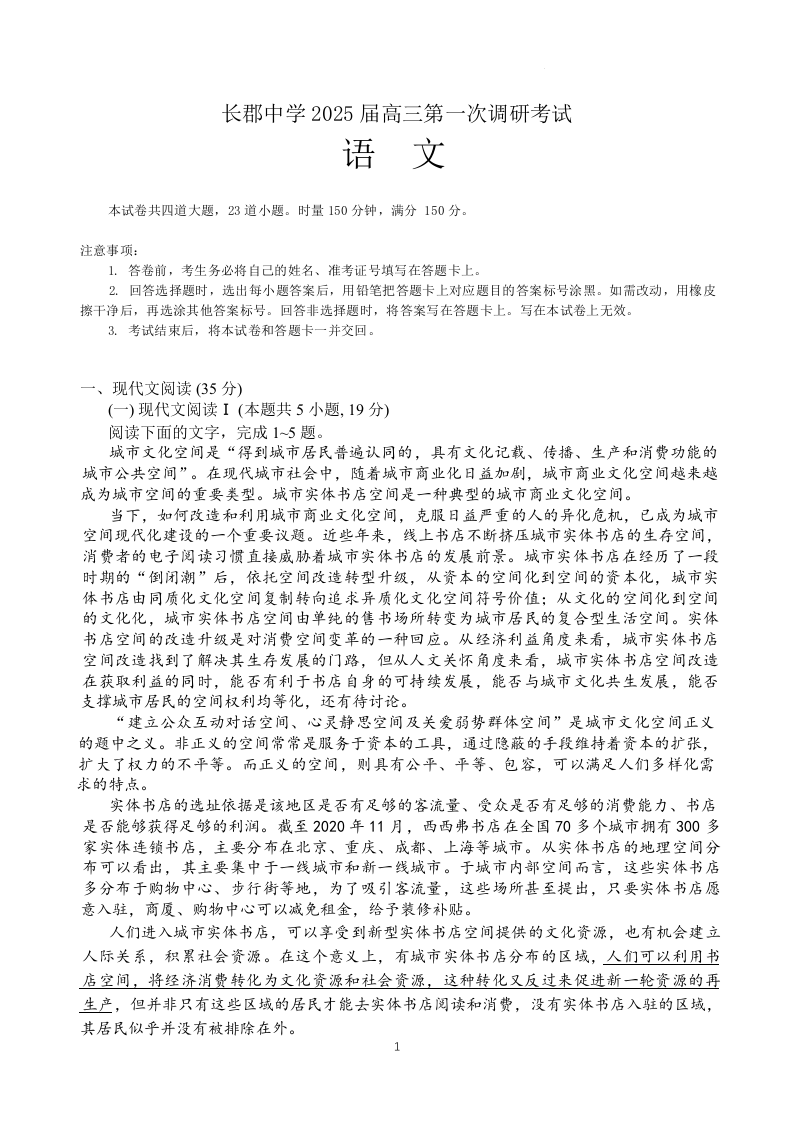 湖南省长郡中学2025届高三上学期第一次调研考试语文