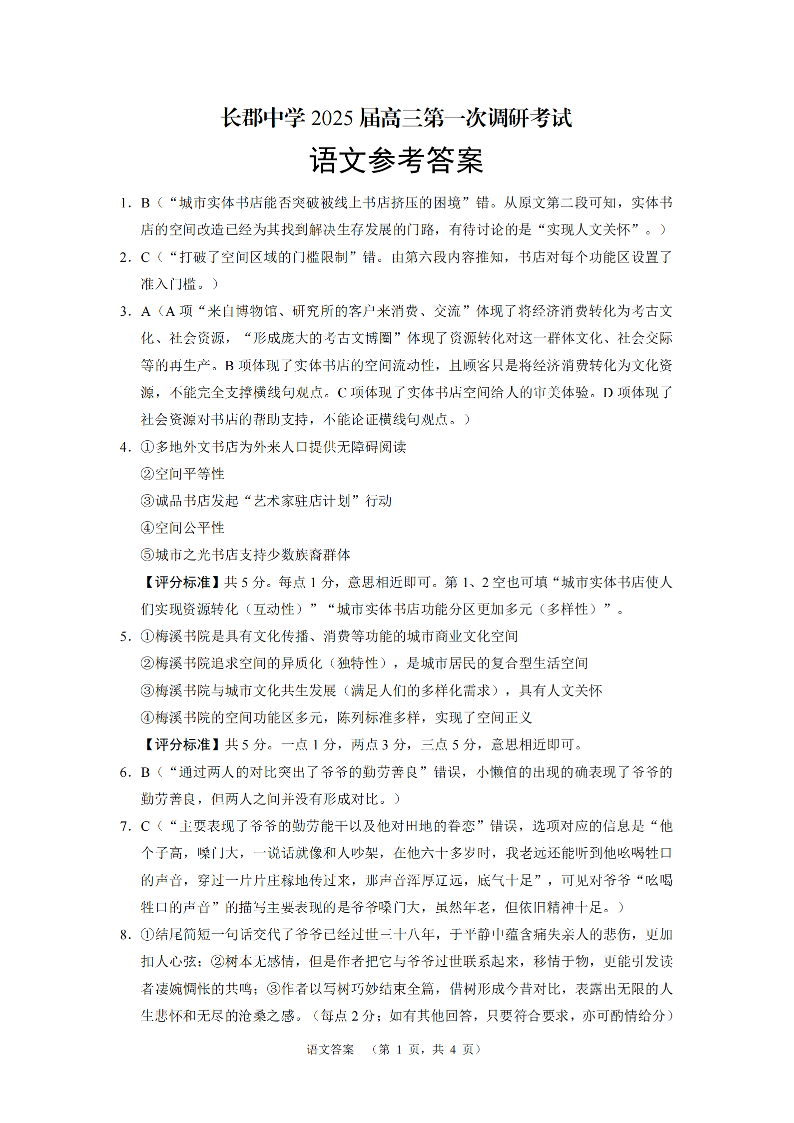 湖南省长郡中学2025届高三上学期第一次调研考试语文答案