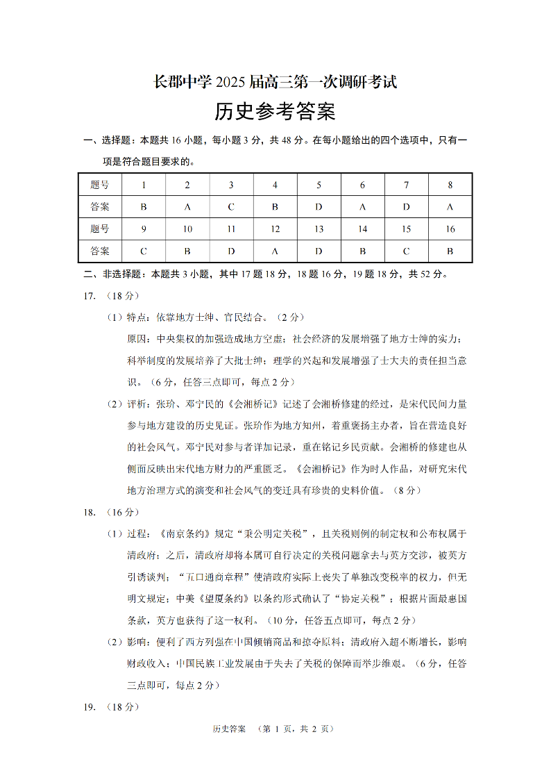 湖南省长郡中学2025届高三上学期第一次调研考试历史答案