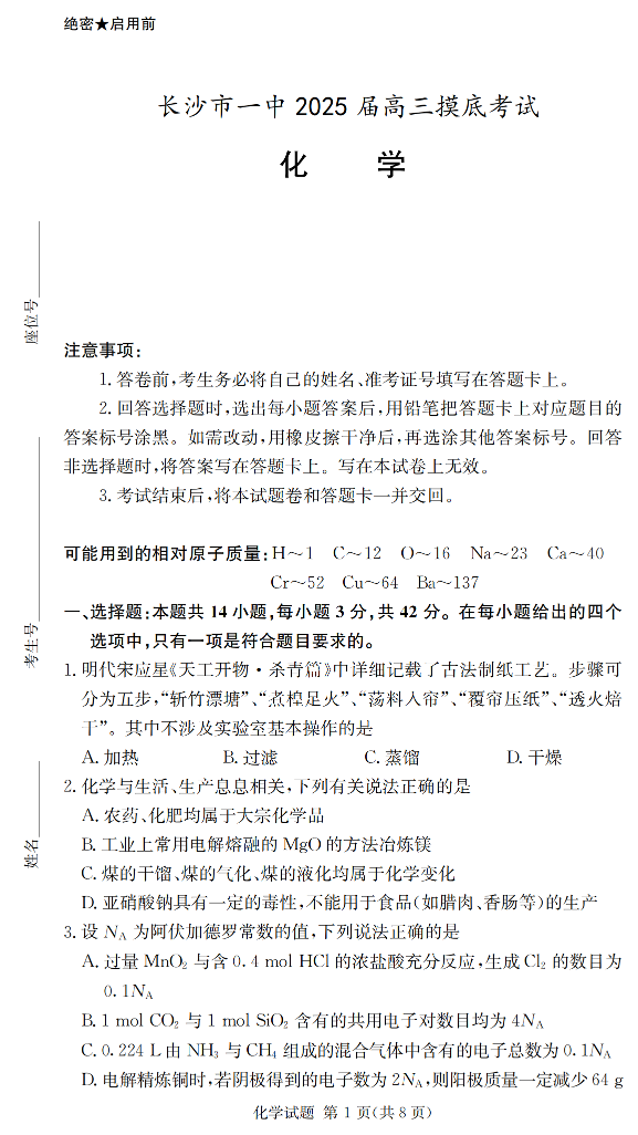 湖南省长沙市第一中学2025届高三上学期摸底考试化学+答案