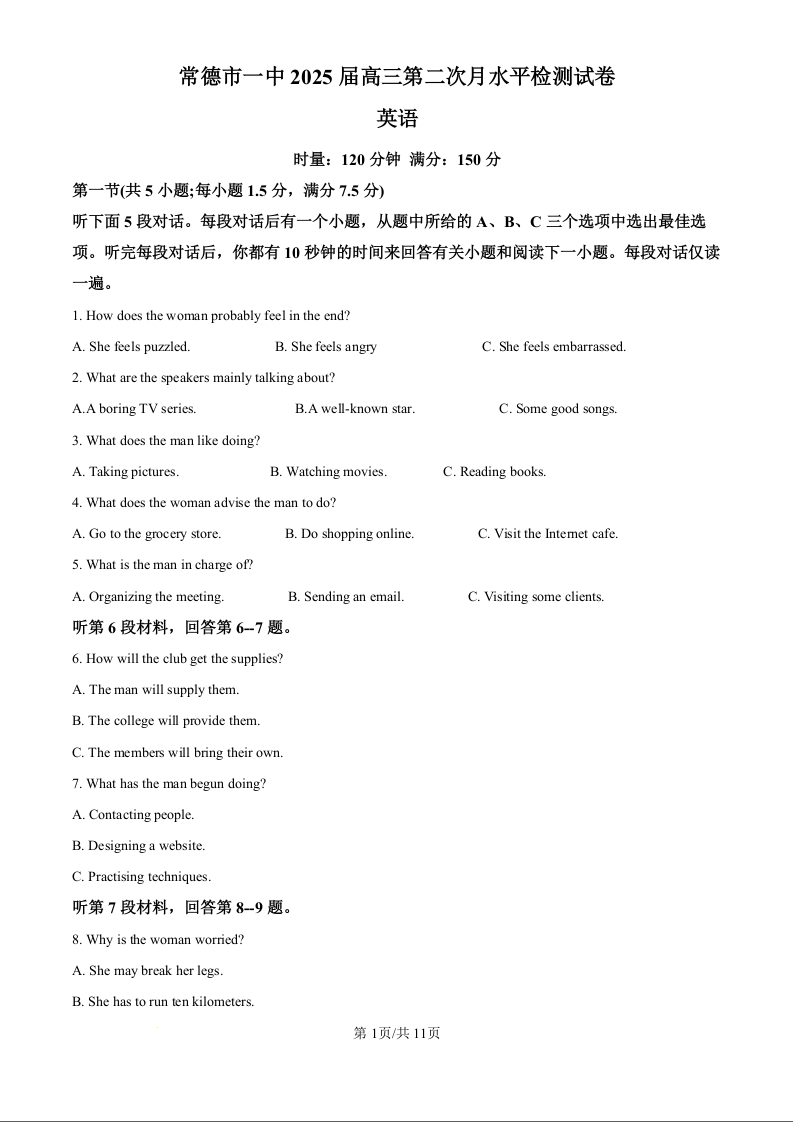 湖南省常德市第一中学2025届高三第二次月水平检测英语试题(原卷版)