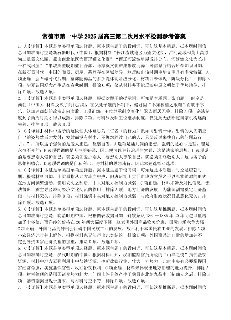 湖南省常德市第一中学2025届高三第二次月水平检测历史答案