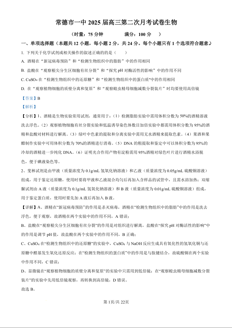 湖南省常德市第一中学2025届高三第二次月水平检测生物试题(解析版)
