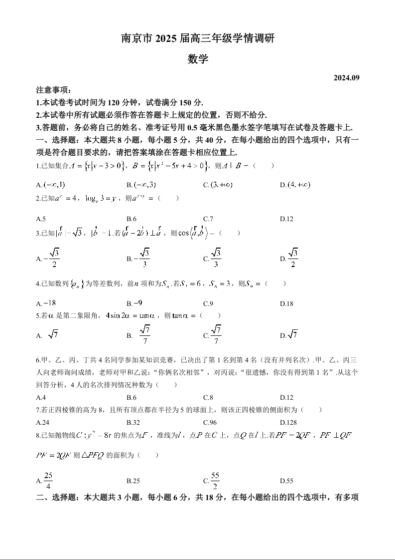 江苏省南京市2025届高三年级学情调研数学+答案