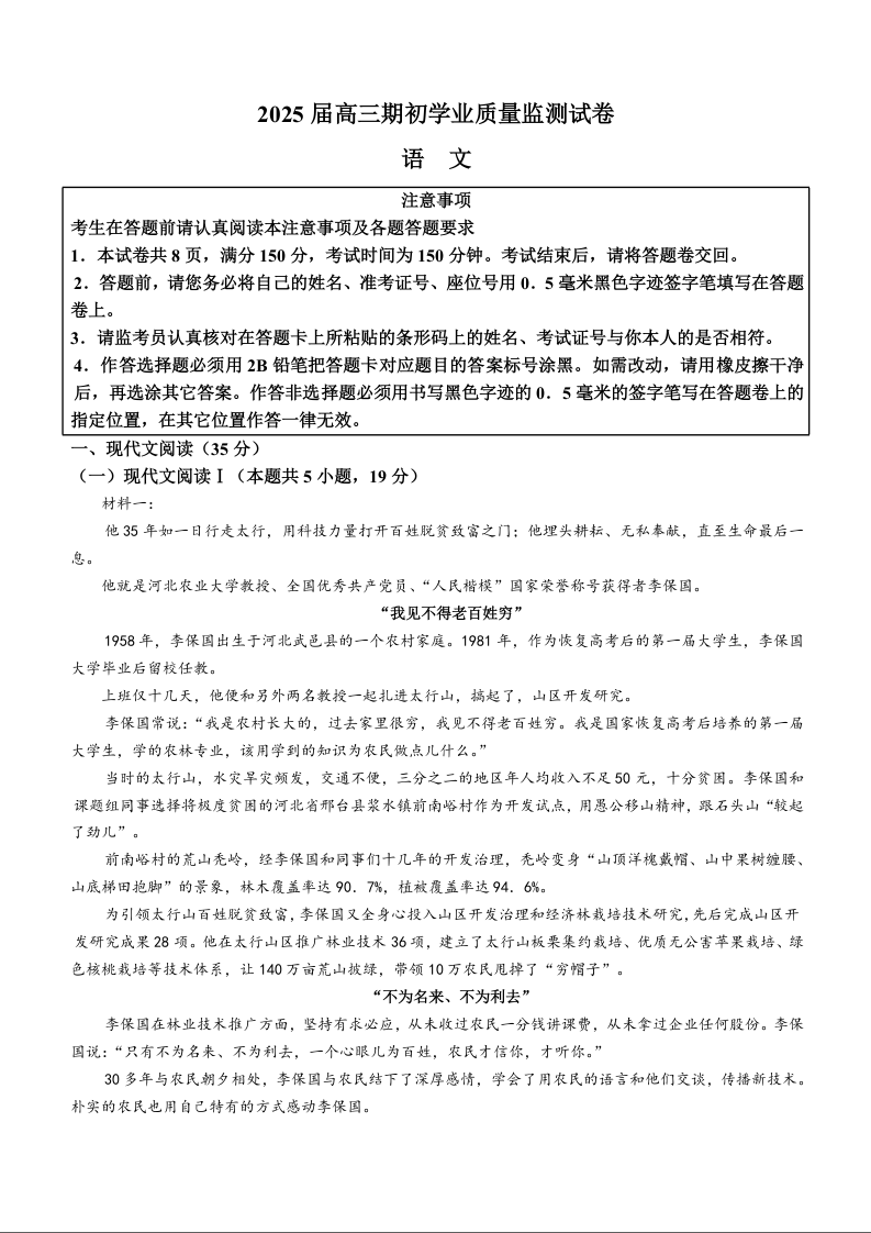 江苏省南通市海安市2025届高三期初学业质量检测试卷语文