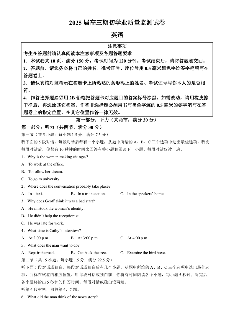 江苏省南通市海安市2025届高三期初学业质量检测试卷英语