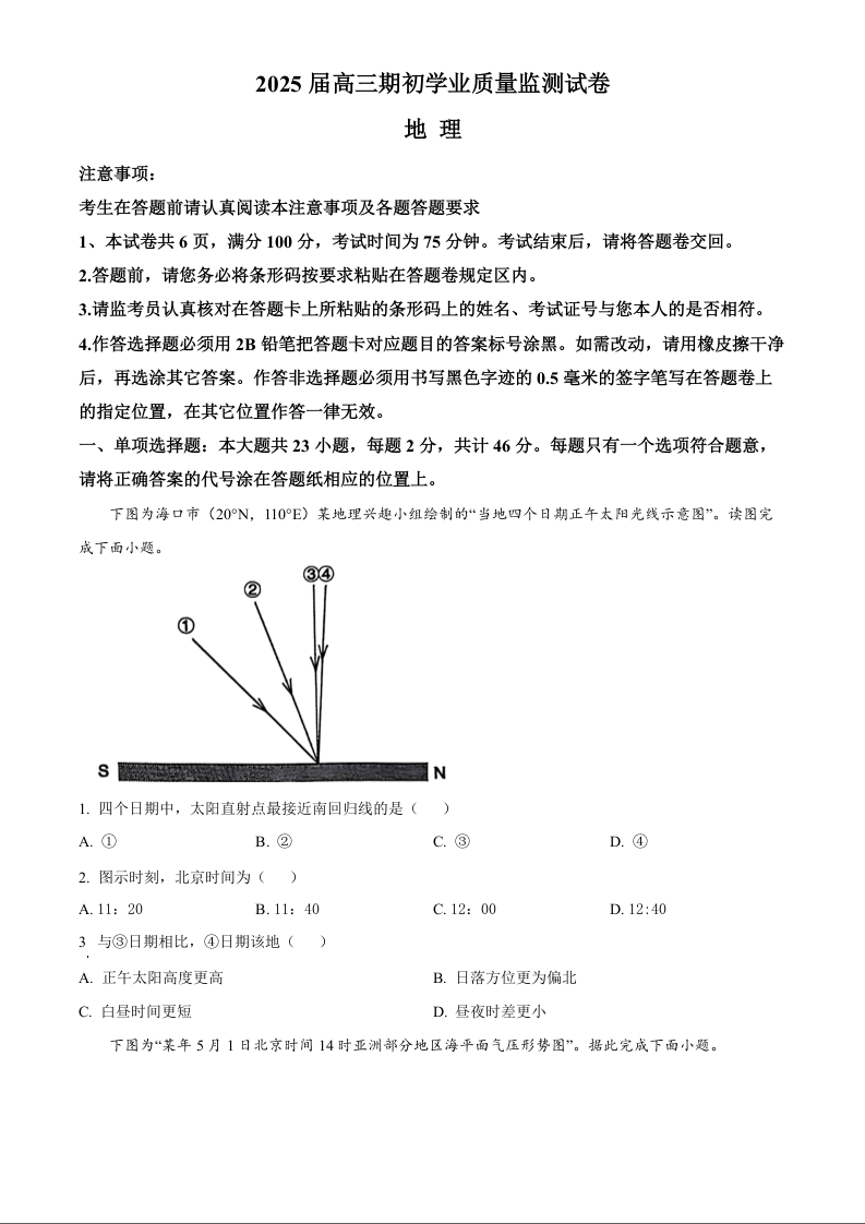 江苏省南通市海安市2025届高三期初学业质量检测试卷地理+答案