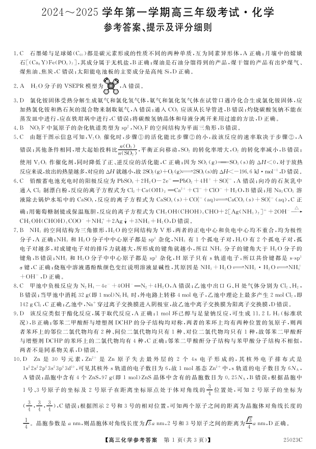 江苏省盐城市盐城八校2024-2025学年第一学期高三年级考试化学答案
