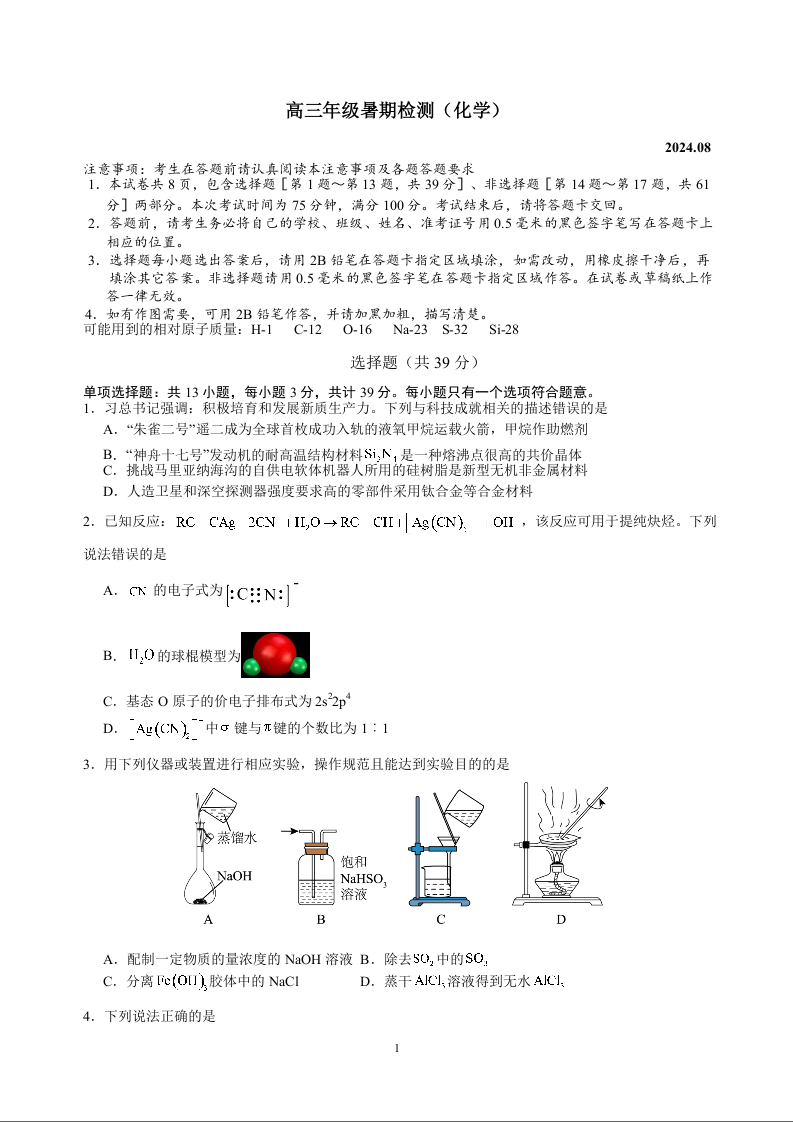 江苏省扬州中学2025届高三年级暑期检测化学+答案