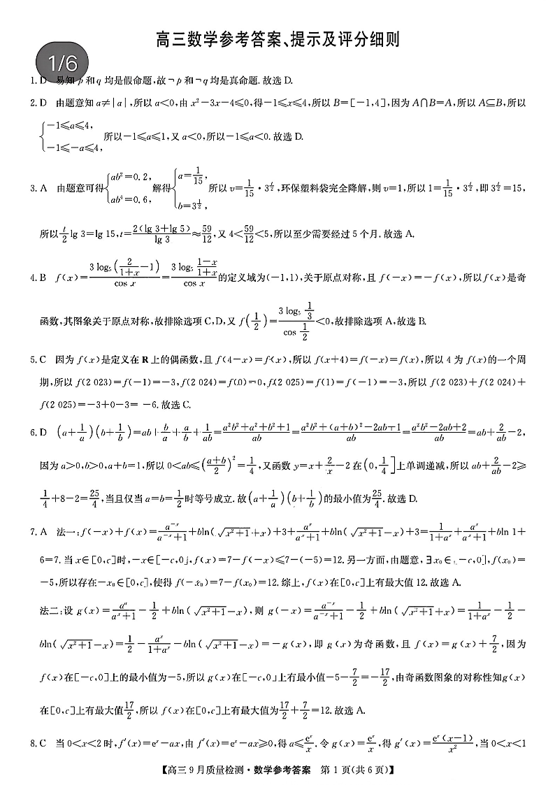 江西省九师联盟2025届高三年级上学期9月联考数学答案